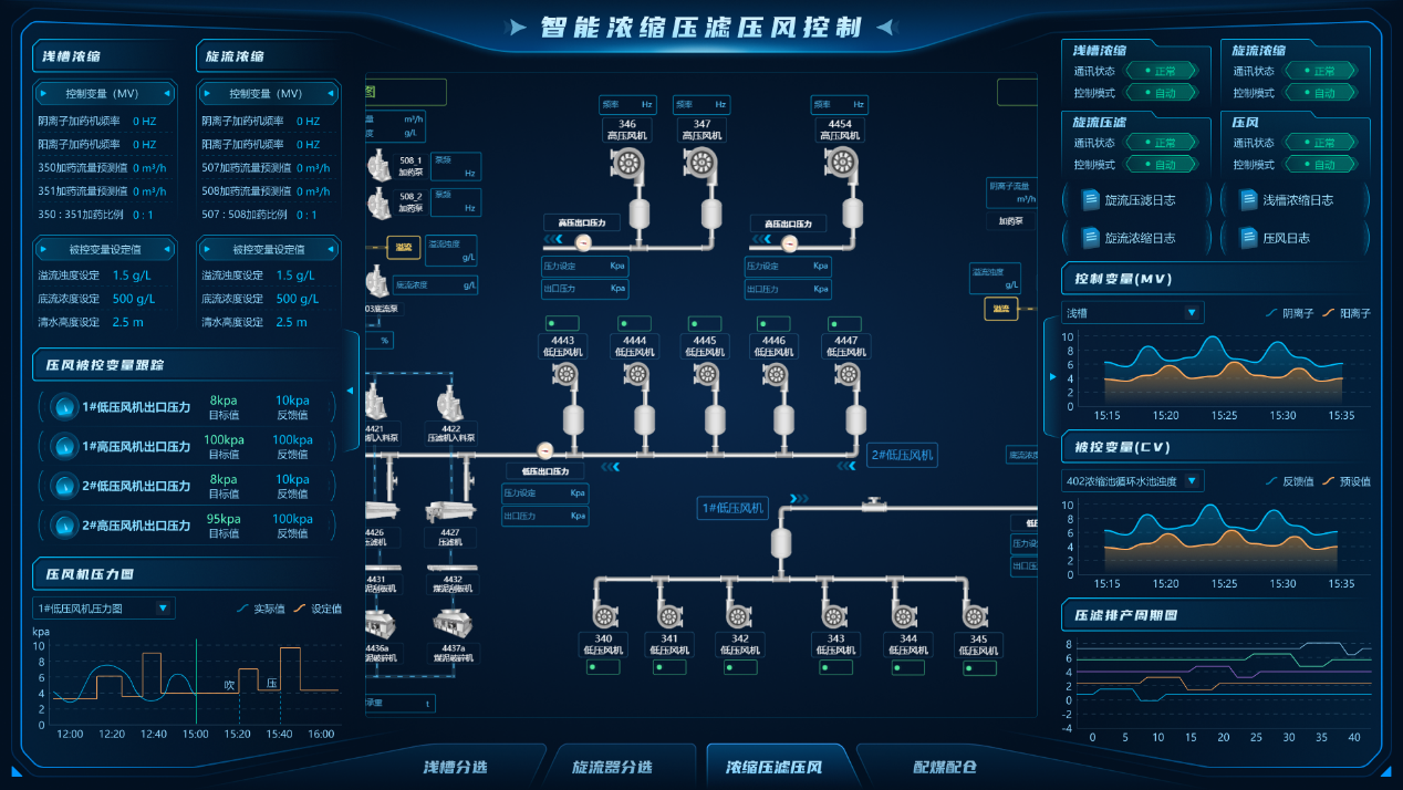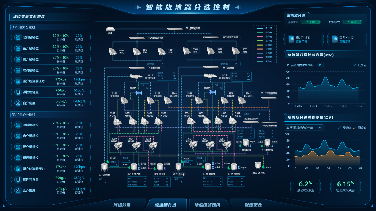 “數(shù)據(jù)-模型雙驅(qū)動(dòng)的選煤廠智能控制與決策系統(tǒng)的研究與應(yīng)用”項(xiàng)目研發(fā)了“數(shù)據(jù)-模型雙驅(qū)動(dòng)”的選煤廠控制系統(tǒng),融合模型預(yù)測控制(MPC)、無模型自適應(yīng)控制(MFAC)與多輸入多輸出預(yù)測模型控制,實(shí)現(xiàn)了重介分選、濃縮壓濾、精準(zhǔn)配煤等環(huán)節(jié)的毫秒級(jí)閉環(huán)控制。