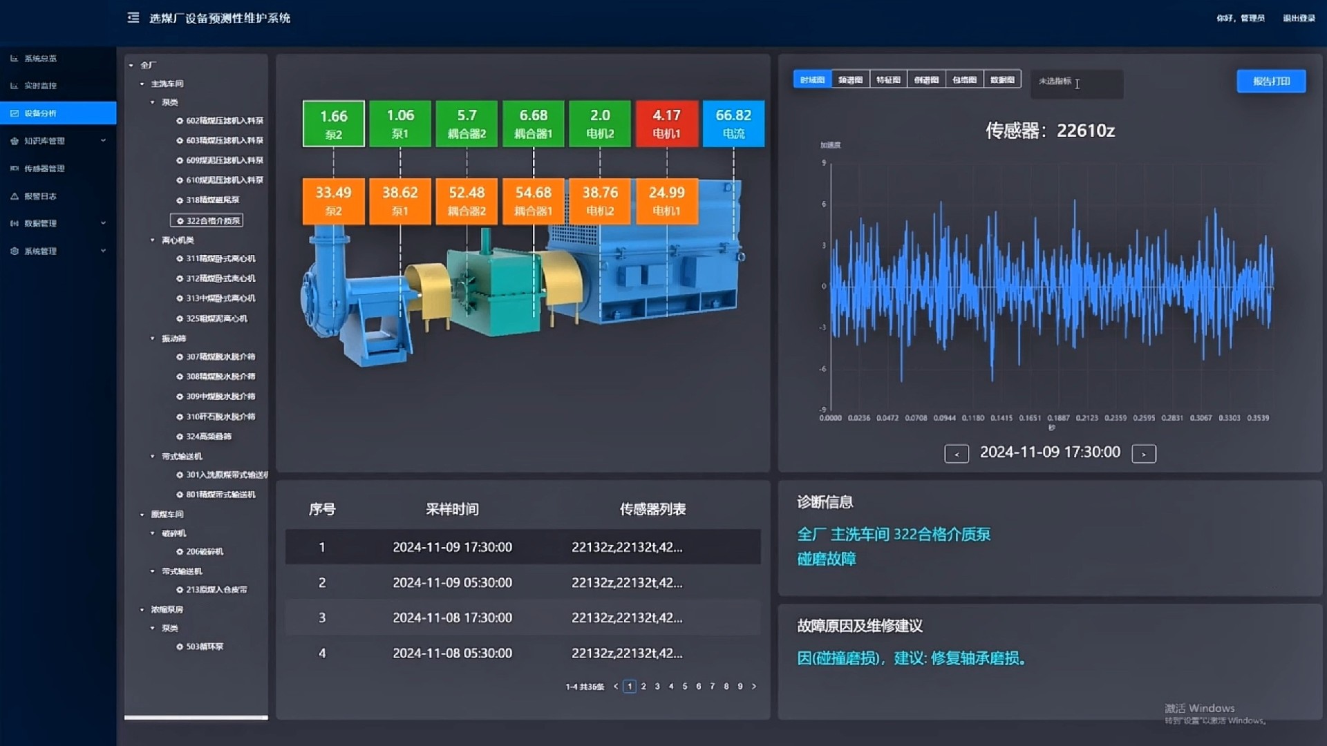 產(chǎn)品簡介:選煤廠設(shè)備預(yù)測性維護系統(tǒng)實時采集選煤廠生產(chǎn)設(shè)備的多維數(shù)據(jù)(溫振數(shù)據(jù)、電氣數(shù)據(jù)、設(shè)備實時數(shù)據(jù)、設(shè)備管理數(shù)據(jù)、音視頻數(shù)據(jù)),利用先進數(shù)字信號處理算法、人工智能算法、專家知識庫等方法對設(shè)備進行實時監(jiān)測、故障分析和故障溯源。在設(shè)備出現(xiàn)異常時,能夠分析出異常原因,給出合理維修建議,生成維修報告并白動推送給檢修人員,指導(dǎo)檢修人員進行設(shè)備維護,實現(xiàn)流程化閉環(huán)管理。選煤廠設(shè)備預(yù)測性維護系統(tǒng)可早期發(fā)現(xiàn)設(shè)備異常,實現(xiàn)由“事后維修”向“預(yù)知檢修”的轉(zhuǎn)變,從而實現(xiàn)設(shè)備維護安全損失最小、總維護成本最低、總維修時間最少。